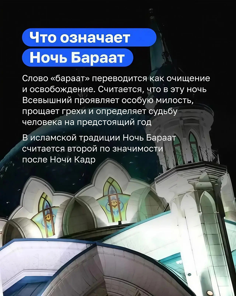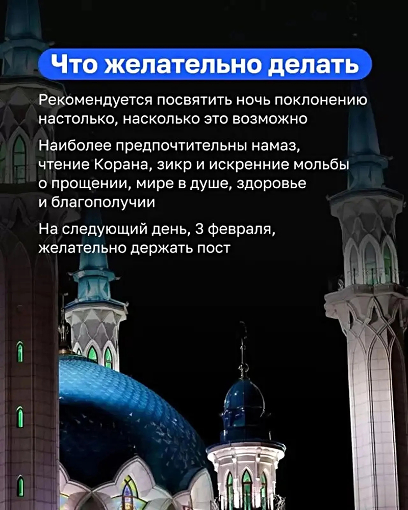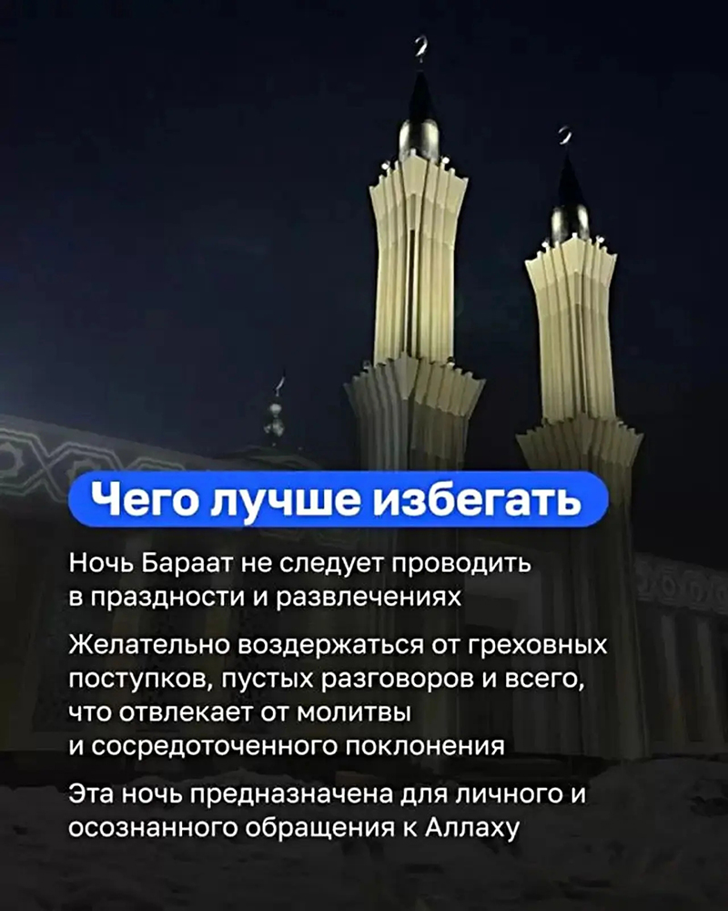 Ночь Бараат желательно посвятить поклонению Всевышнему. Исполнять желательные молитвы, такие как витр, тахаджуд и просто желательный намаз (мутляк). Если у кого есть пропущенные молитвы, конечно же, в первую очередь следует возмещать их. Побольше читать зикр, салават на Пророка ﷺ Всевышнего, исполнять свои вирды… Передаётся от супруги Посланника Аллаха Аиши (да будет доволен ею Аллах), которая сказала, что Посланник Аллаха ﷺ сказал ей: «<…>Поистине, этой ночью Аллах освобождает Своих рабов от Ада по количеству волос в шерсти овец племени Бану Кальб». (Хадис передали ат-Тирмизи, ИбнуМаджа, имам Ахмад, Ибну Абу Шайба, аль-Байхаки, аль-Багави, Исхак бин Рахавих, ад-Дайлями.)