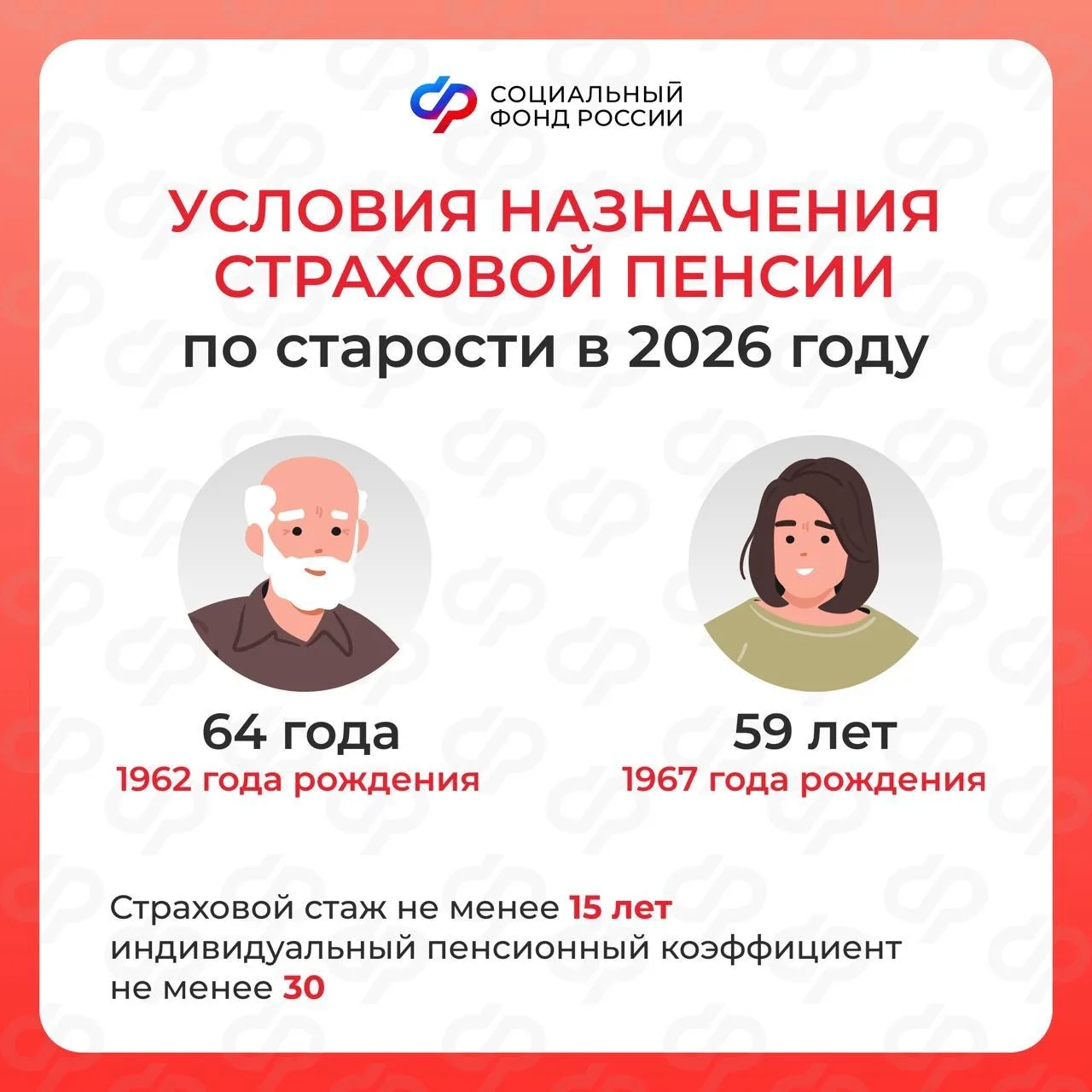 Пенсионный возраст в 2026 году: • мужчины 1962 года рождения — 64 года • женщины 1967 года рождения — 59 лет